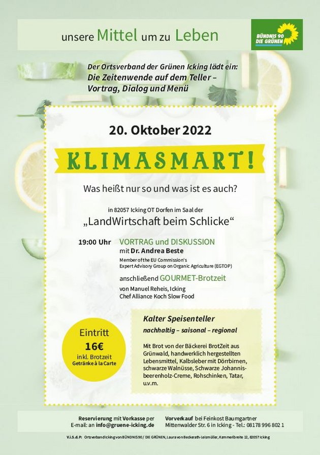 Der Ortsverband der Grünen lädt ein zu Vortrag, Dialog und Brotzeit: „Die Zeitenwende auf dem Teller - Klimasmart! Was heißt nur so und was ist es auch?“ am 20. Oktober um 19 Uhr in Dorfen in der „LandWirtschaft beim Schlicke“. Die renommierte Bodenexpertin Dr. Andrea Beste erläutert im Vortrag wie Ackerbau und Tierhaltung wirklich nachhaltig klimaschonend und klima-angepasst gestaltet werden können. Warum man dafür Rinder nicht verteufeln darf und wie man landwirtschaftliche Systeme „resilient“ macht, damit sie Extremwetterlagen möglichst lange ausgleichen können. Nach Vortrag und Diskussion gibt es eine Gourmet-Brotzeit, die vom Ickinger Slow Food Koch Manuel Reheis gestaltet wird. Der Eintritt für Vortrag inkl. Brotzeit beträgt 16 EUR. Karten sind bei Feinkost Baumgartner erhältlich oder können bis spätestens 17.10.2022 per E-Mail unter info@gruene-icking.de reserviert werden (mit Vorkasse). Einen Flyer zur Veranstaltung mit weiteren Infos finden Sie hier.